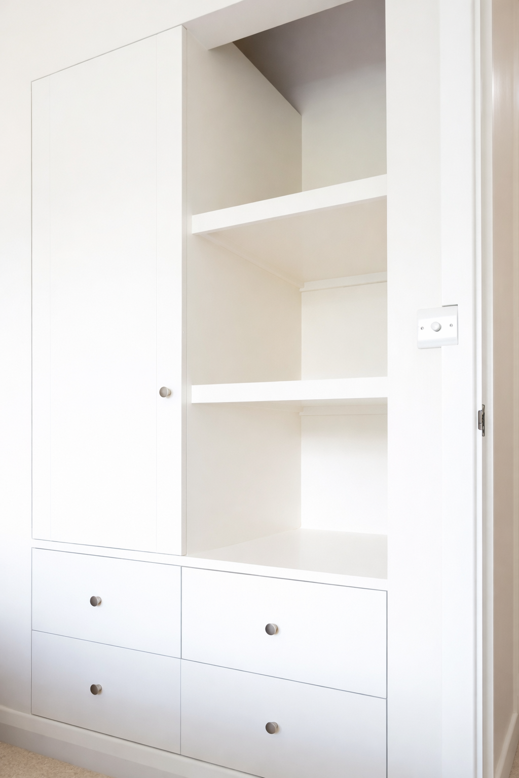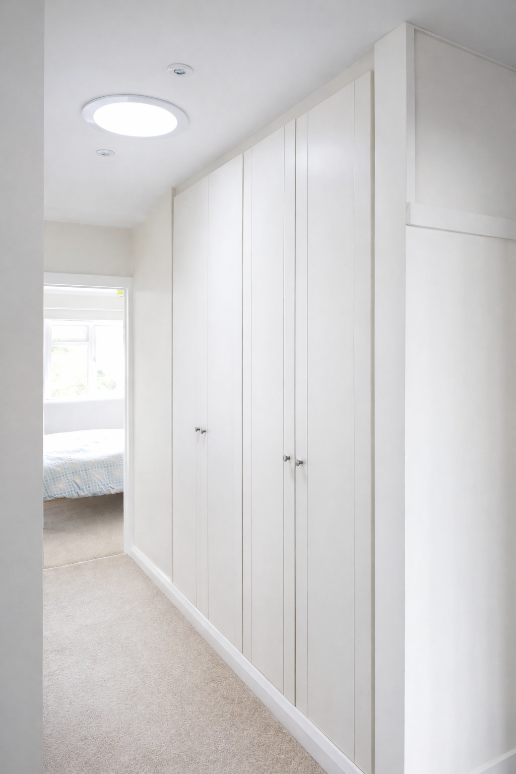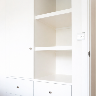 Bespoke joinery played a key role in the transformation. Custom wardrobes, hallway storage, and a living room display unit were designed and built to fit perfectly, combining practicality with a high-end finish. These elements, alongside carefully considered interior design choices, created a cohesive and highly functional home environment.