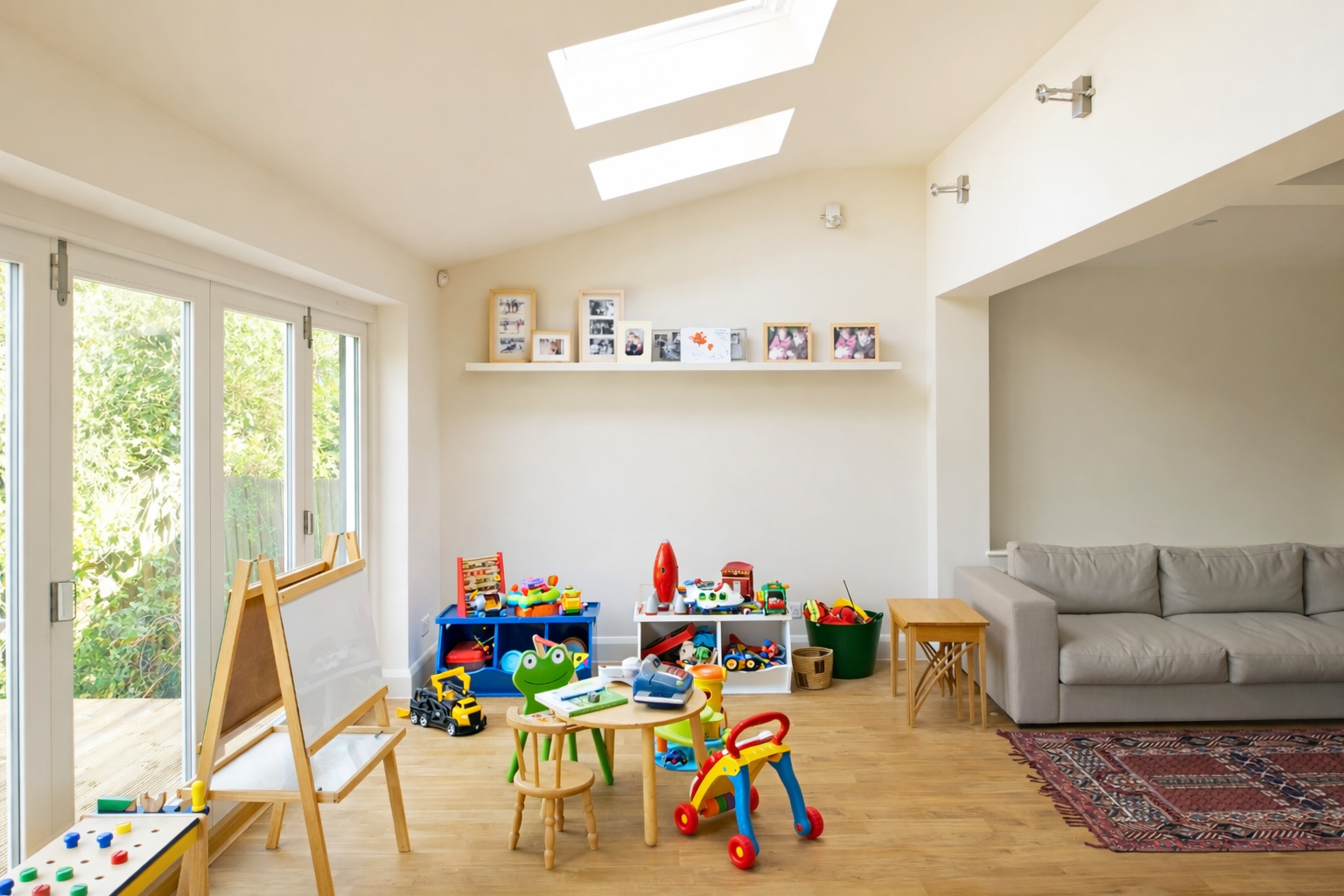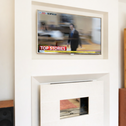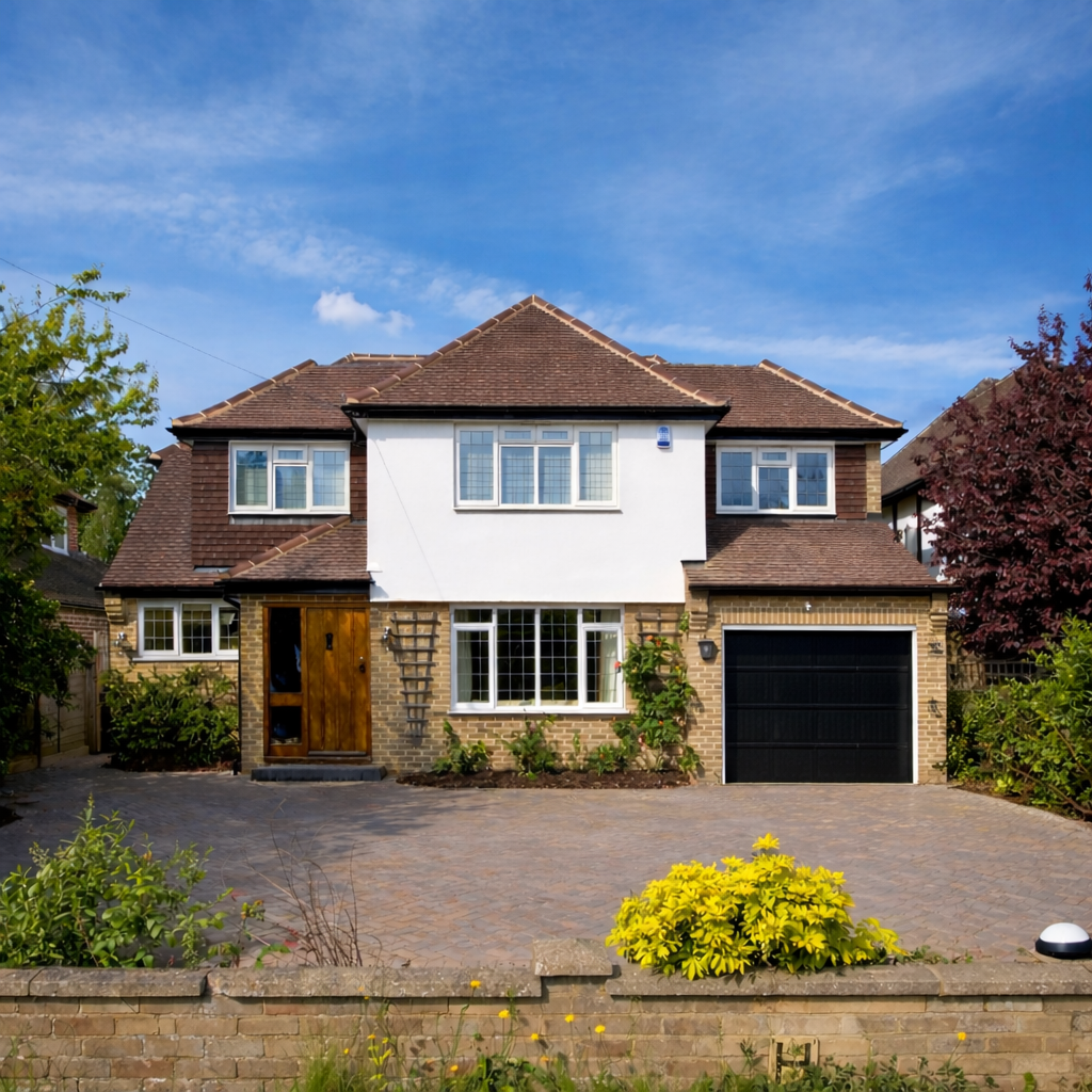 Modern living was enhanced with underfloor heating in the kitchen dining space, as well as full data cabling and high-spec AV installations, including a hardwired Sonos system with integrated speakers across multiple rooms. A former garage was converted into a functional home office, tailored to the client’s needs.